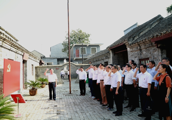 在新四军淮上办事处纪念馆院内,面向鲜红的党旗,全体党员整齐列队,高举右拳,在党委书记刘泽功的领誓下,大声庄严宣誓:“我志愿加入中国共产党,拥护党的纲领,遵守党的章程……”,铿锵有力的宣誓表达了全体党员同志对党无限忠诚,为共产主义事业奋斗终身的坚定决心。