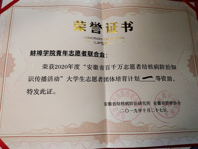 2019年10月25—27日,安徽省“百千万志愿者结核病防治知识传播活动”暨2020年度“大学生团体培育计划”在合肥举行。蚌埠学院青年志愿者联合会会长陈虎和人力资源组部长刘佳慧携结核病防治项目参加此次培训,并获得2020年度“安徽省百千万志愿者结核病防治知识传播活动”大学生志愿者团体培育计划一等资助。