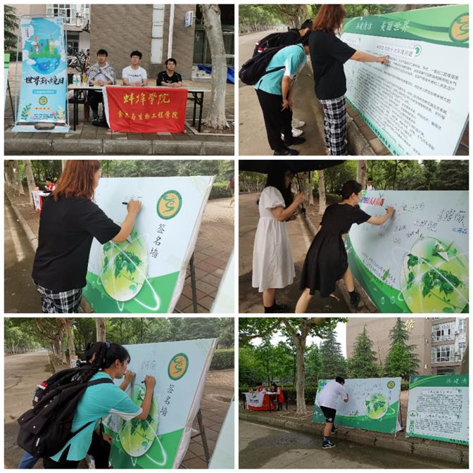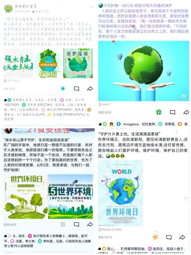 征集口号,共建美丽世界。结合今年世界环境日的主题“共建清洁美丽世界”,蚌院学子们充分发挥自己的才能,在朋友圈发表保护环境的宣传口号。如,“绿色环保记于心,绿水青山协同行”、“今天的每一点行动,都是对明天的最好保护”等等。参赛同学纷纷表示,“环境是大家共同生存的地方,也是需要我们共同保护的对象。保护环境,人人有责,保护环境,从身边点点滴滴做起。”