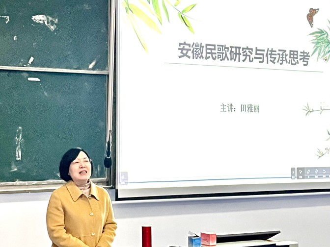 讲座以什么是民歌的提问开始,田雅丽展示了3首歌曲视频让同学们辨别,以此引出了民歌的概念。随后,田雅丽分享了自己多年来的研究安徽民歌的成果和经验,依次讲解了五河民歌、凤阳民歌、徽州民歌、大别山民歌、当涂民歌、巢湖民歌6项入选国家级非物质文化遗产的地方民歌以及全椒民歌等7项入选省级非物质文化遗产的民歌。从各地民歌的起源与历史发展、地貌特征、生产方式、社会文化等方面的联系,她对民歌的音乐特征等方面做了深入解读。对于民歌传承保护方面,田雅丽认为首先要深入挖掘民歌资源,她多年来进行的田野工作采集了大量的民歌资料,而且如数家珍,随口即能唱出韵味纯正的各地代表民歌。其次是民歌引入高校的传承,介绍了安徽大学艺术学院民歌研究团队近年来开展的传承活动以及取得的成效,同时也讲解了自己研究民歌过程中申报科研项目、出版著作、录制唱片等方面的经验。