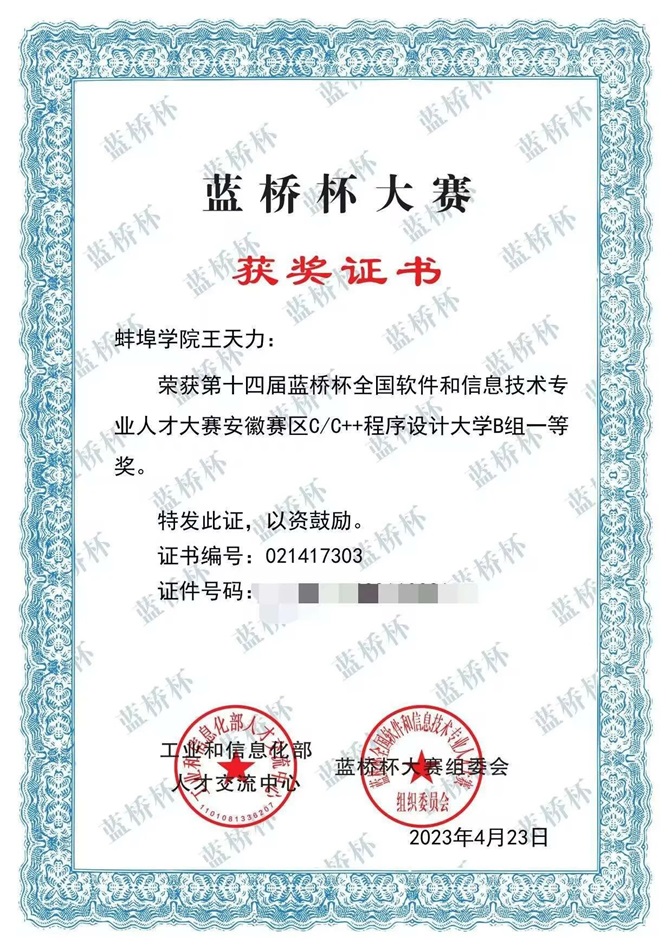 经过几个月的激烈角逐,第十四届蓝桥杯全国软件和信息技术专业人才大赛落下帷幕。本次蓝桥杯大赛中,我校2020级物联网工程王天力同学在姜雪老师的指导下锐意进取,取得了蓝桥杯大赛C++程序设计大学生B组省赛一等奖、国赛二等奖的好成绩。他的奋斗故事成为了蚌院学子在前行道路上的榜样。