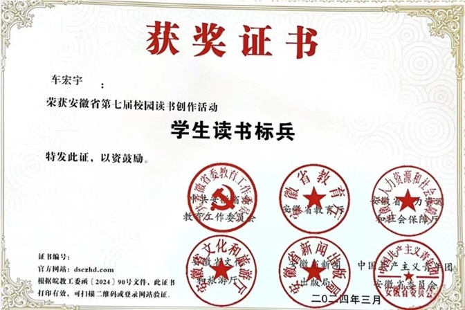 翻开书本,在每一页中感受历史的脉搏,透过文字,一笔一划皆是文化的厚重。读好一本书,读懂一本书,在书中找寻自己,看见未来。今天,让我们走近安徽省“学生读书标兵”车宏宇身边,聆听她与读书的故事。