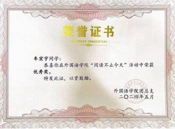 “星光不问赶路人,江河眷顾奋楫者”,不论是知识的积累、视野的拓展,还是与书中人物的情感共鸣,车宏宇在浩瀚书海中受益匪浅,收获满满,秉持着对阅读的热爱,一步一个脚印,在前进路上不断绽放出属于自己的光芒。