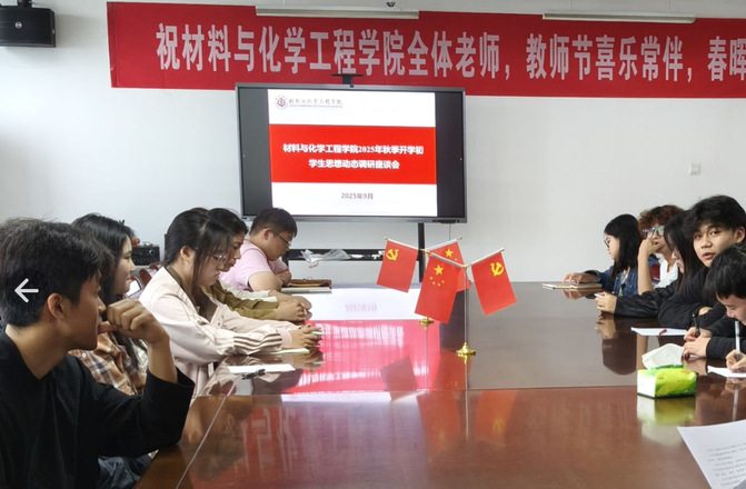 为贯彻落实校党委关于加强新学期师生思想政治工作的部署要求,及时准确把握学生返校后的思想动态和现实需求,9月26日中午,材料与化学工程学院在F1514会议室召开了2025年秋季学期学生思想动态调研座谈会。会议由学院党委副书记朱银邦主持,院团委副书记陈艳文,各班级学生代表参加。
