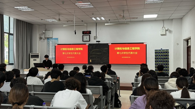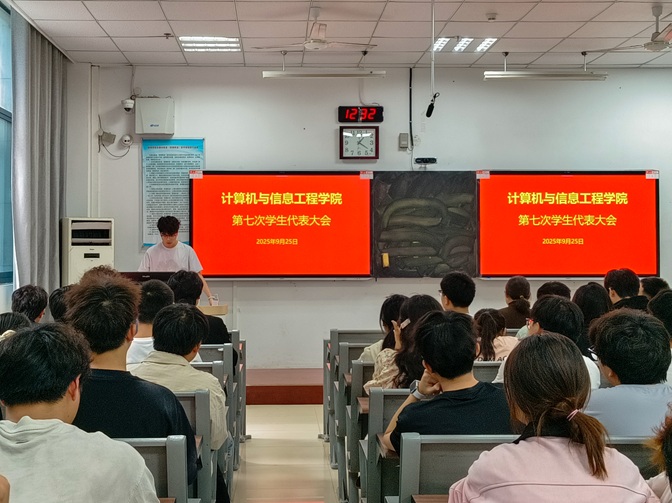 2025年9月25日,计算机与信息工程学院第七次学生代表大会在G103教室召开。学院党委副书记李丽、团委副书记谢齐,院学生会代表、学生干部代表及学生代表参加会议。
