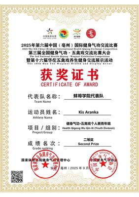 在近期的第六届中国(亳州)国际健身气功交流比赛中,我校匈牙利籍教师Kis Aranka凭借出色的演绎和对健身气功的深刻理解,荣获二等奖,不仅为学校增添了光彩,也为中外文化交流搭建了新的桥梁。
