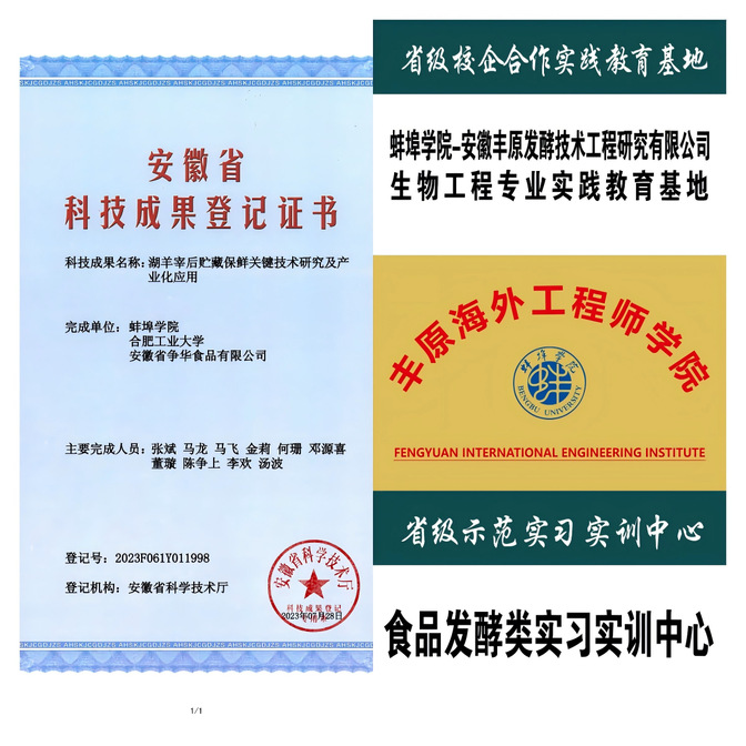 学院聚焦皖北及蚌埠区域发展需求。在特色农产品绿色加工、畜禽肉制品加工与安全、食品合成生物学等3个方向发力,与安徽丰原集团等6个头部企业建立长期稳定的校外实践教学基地,开展产学研合作项目研究,促进科技成果转化和产业化,为蚌埠市生物工程相关产业的发展提供技术支持和人才保障。