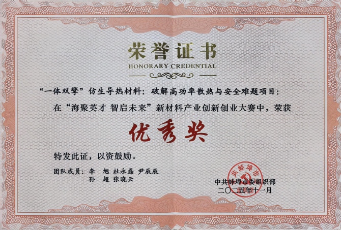 李旭团队的“‘一体双擎’仿生导热材料”项目,聚焦高功率设备散热与安全难题,技术创新性与应用价值突出,获得创新组优秀奖,其团队成员杜永磊、尹辰辰、孙超、张晓云等4名博士教师均来自材化学院,全面参与了项目研发以及决赛答辩等环节工作。
