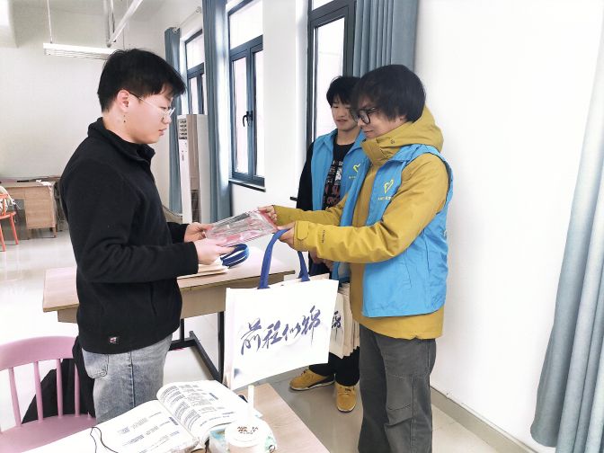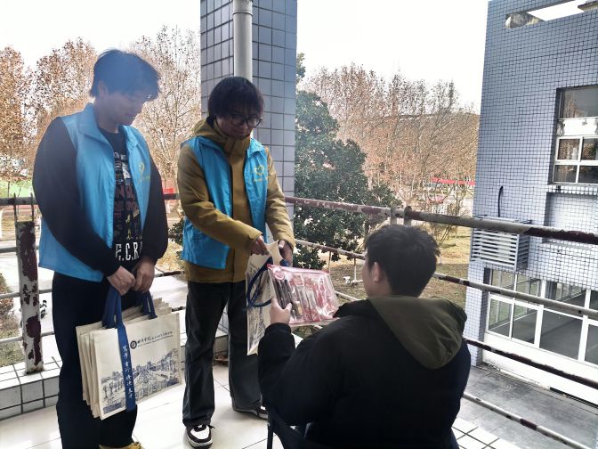 与此同时,在图书馆、自习室等考研学子集中的学习场所,学院考研学社与学生会代表们也同步开展了礼包发放活动。为了不过多打扰同学们宝贵的复习时间,学生代表们轻步穿梭于一排排书桌之间,将礼包悄悄放置在专注学习的学子手边,或利用休息间隙进行简短而热情的赠送。礼包虽轻,情谊却重,一份份承载着师弟师妹们真挚祝福的礼物,为静谧而紧张的学习空间注入了一股暖流。收到礼包的同学们露出惊喜的笑容短暂交流中彼此加油打气,共同凝聚起拼搏向上的力量。