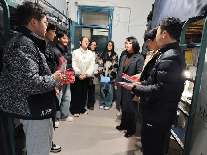 12月16下午,学院党委书记哈焱、党委副书记马程与辅导员们一同走进学生寝室,将一份份精心准备的礼包亲手递到考研同学手中。每到一间宿舍书记都与同学们亲切交流,细致询问大家的复习进度、生活状况与心理状态,叮嘱同学们在冲刺阶段要科学规划、劳逸结合,保持平稳心态,同时注意防寒保暖和身体健康。“学院永远是大家最坚实的后盾,有什么困难和需求随时提出来。”暖心的话语和实实在在的关怀,让寝室内洋溢着温暖与感动。同学们纷纷表示,这份突如其来的惊喜不仅带来了实用的文具,更给予了他们莫大的精神鼓舞。