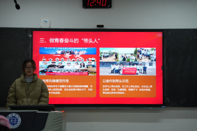 为充分发挥青年学生的主体作用,让全会精神在青年群体中入脑入心,校团委组建“青语团声”大学生宣讲团,以“以青春之我担时代之责”为主题,面向全体青马学员开展专题宣讲会。青年宣讲员们结合自身学习实践和感悟,通过PPT演示、心得分享等形式,围绕高质量发展、以人民为中心、接续奋斗的青春担当等主题,以“青言青语”开展互动化宣讲,用生动鲜活的表达传递党的声音,展现新时代青年的责任与担当。“朋辈宣讲”模式既淬炼了青年宣讲员的理论功底和政治素养,又让全会精神的传播更接地气、更具活力,有效凝聚了青年一代奋进新征程的磅礴力量。