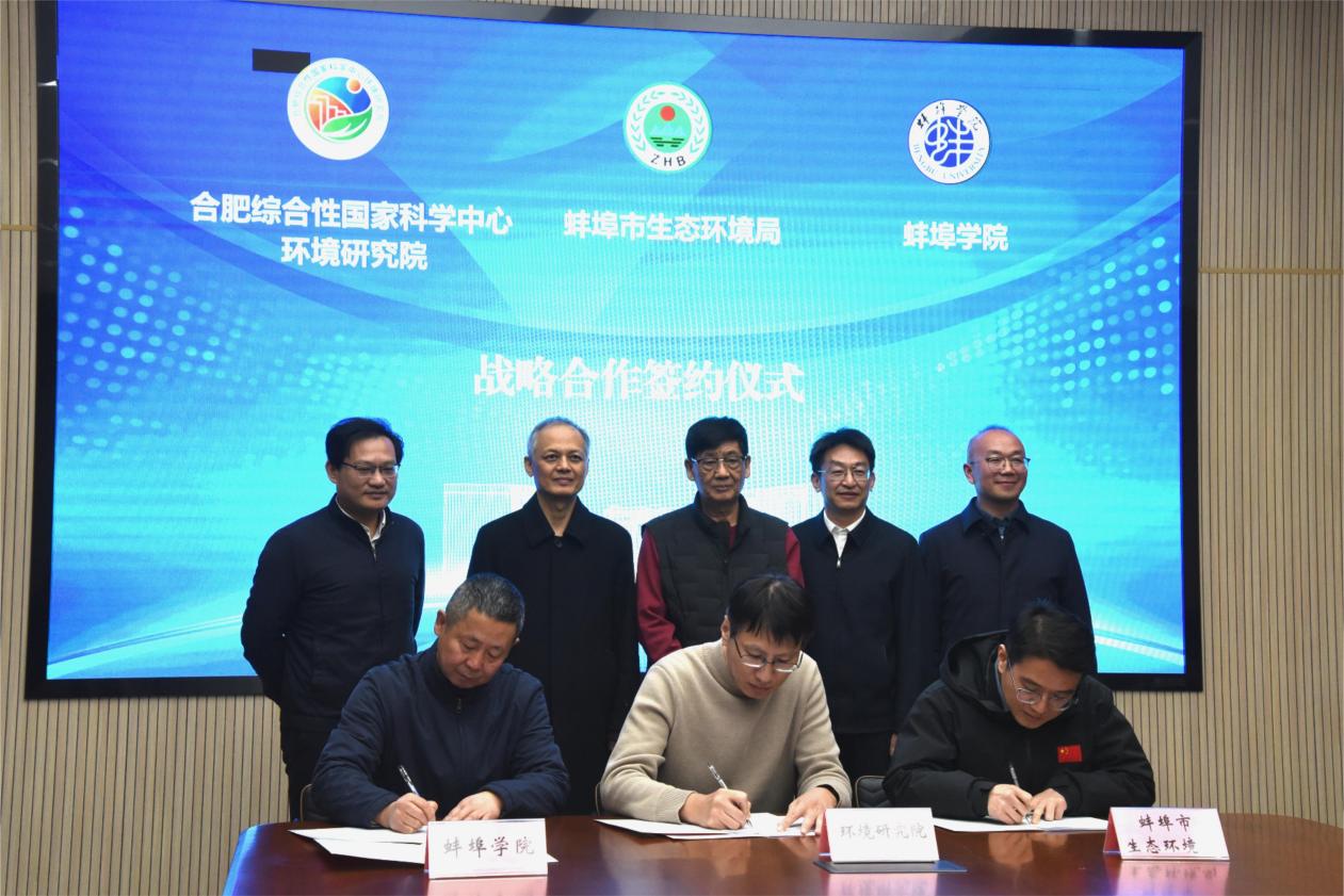 1月4日上午,合肥综合性国家科学中心环境研究院、蚌埠市生态环境局、蚌埠学院生态环境战略合作框架协议在合肥综合性国家科学中心环境研究院正式签署。中国工程院院士、环境研究院科技委主任刘文清,安徽省生态环境厅副厅长、一级巡视员罗宏,蚌埠学院校长张亚新,蚌埠市生态环境局党组书记、局长陈伟出席仪式并致辞。党委委员、纪委书记、监察专员杨安成及有关部门、学院主要负责同志见证了签约仪式。