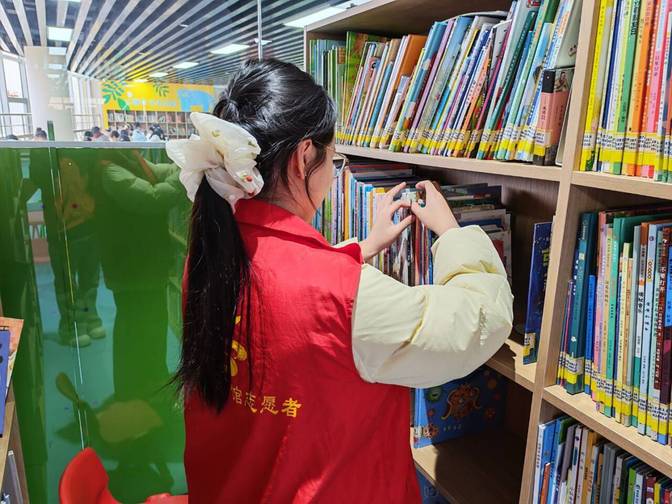 活动现场,志愿者们身着统一志愿马甲,以饱满的热情迅速投入服务工作。大家分工明确、协作有序,主动为前来借阅的读者提供贴心指引,耐心引导小读者与家长遵守馆内规定、做到文明阅读、规范借阅;同时细心整理书架图书、维护馆内阅读秩序,用真诚的态度、文明的举止,为少儿图书馆的书香氛围增添了一抹温暖的青春亮色。