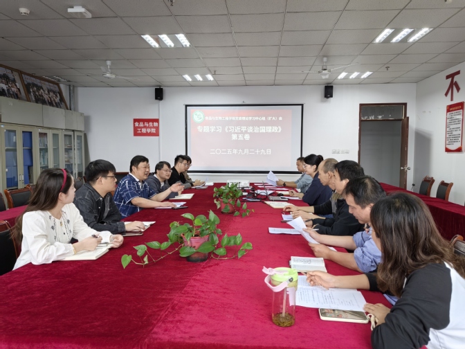 9月29日,食品与生物工程学院党委理论学习中心组召开专题学习(扩大)会,专题学习《习近平谈治国理政》第五卷第十专题《全面推进美丽中国建设》。院党委书记王永斌主持会议,党委理论学习中心组成员、科级干部和党支部书记参加会议。学习会上,中心组成员原原本本学习了第十专题的相关内容,深刻领会了全面推进美丽中国建设的重大意义、总体要求和重点任务。大家一致认为,《习近平谈治国理政》第五卷集中展现了坚持“两个结合”...
