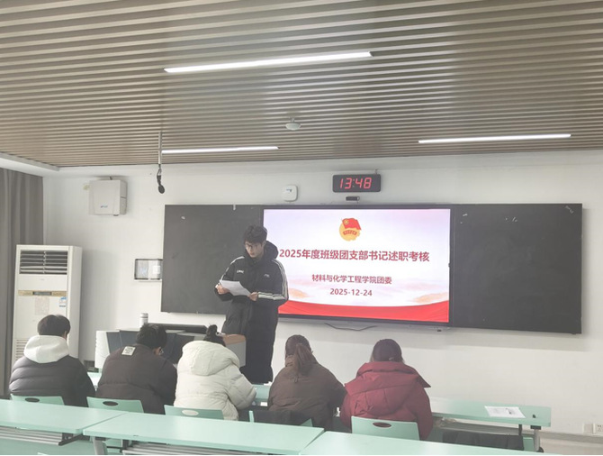 为夯实基层团组织建设,检验团支书履职实效,材料与化学工程学院于12月24日开展班级团支部书记述职考核大会。述职环节,各团支部书记结合实际以案例汇报履职成果。思想引领上,围绕党的二十届四中全会精神学习、就业观教育等主题,通过主题团日等形式开展理论教育;组织建设方面,说明“智慧团建”维护、团员档案管理、团费收缴及推优入党等基础工作落实情况;实践服务上,汇报四六级考试和考研经验分享会、宿舍矛盾协调、学业帮扶...