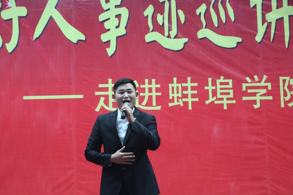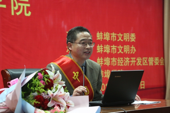 为进一步展示蚌埠市全国文明城市创建成果,充分发挥道德模范及“身边好人”的道德引领作用,大力营造学习先进、崇尚先进、赶超先进的浓厚氛围,推进公民思想道德建设的深入开展,11月21日,由蚌埠市文明委主办,蚌埠学院、蚌埠市文明办、蚌埠市经开区管委会承办的“‘模范引领崇德向善 蚌埠身边好人事迹巡讲进高校’活动——走进蚌埠学院”在学术报告厅隆重举行。