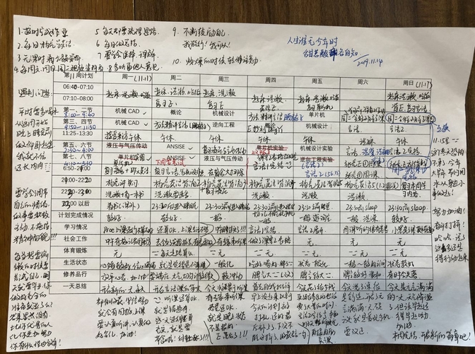 “我的学业导师李大胜老师曾在群里分享过一张清华学霸的学习计划表,当时我觉得这种方式相比于以前我列的计划更加详细,就自己学着做了。”徐光媛拿出一张周计划表,表格上面写满了密密麻麻的字,从早上几点起床到晚上几点睡觉,每一个时间段做什么都写得十分详细,不仅如此,每天结束后她还会对这一天计划的完成情况做一个总结,一天一小结,一周一大结。