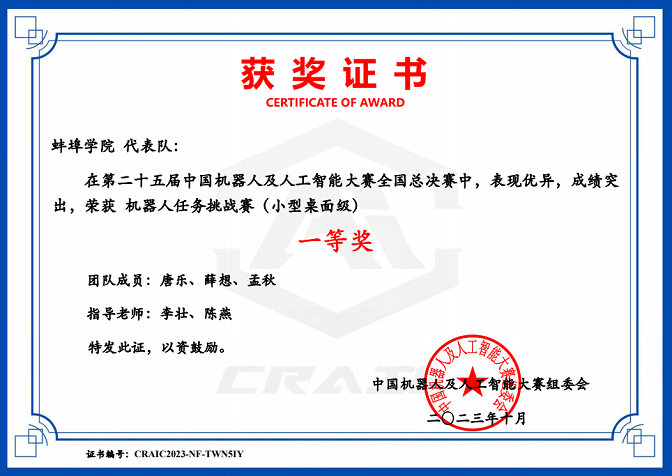 9月25日,第二十五届中国机器人及人工智能大赛全国总决赛在江苏昆山苏州大学应用技术学院圆满落幕。经过激烈角逐,蚌埠学院电子与电气工程学院学生团队在小型桌面应用场景赛道,斩获国家级一等奖1项、国家级二等奖1项、国家级三等奖1项。由20级电气工程及其自动化1班唐乐、20级机器人工程班孟秋、21级电气工程及其自动化2班薛想三位同学组成的“年少有为队”,在李壮、陈燕老师指导下,勇夺国家级一等奖。