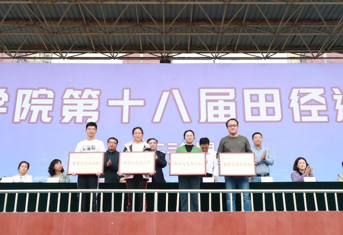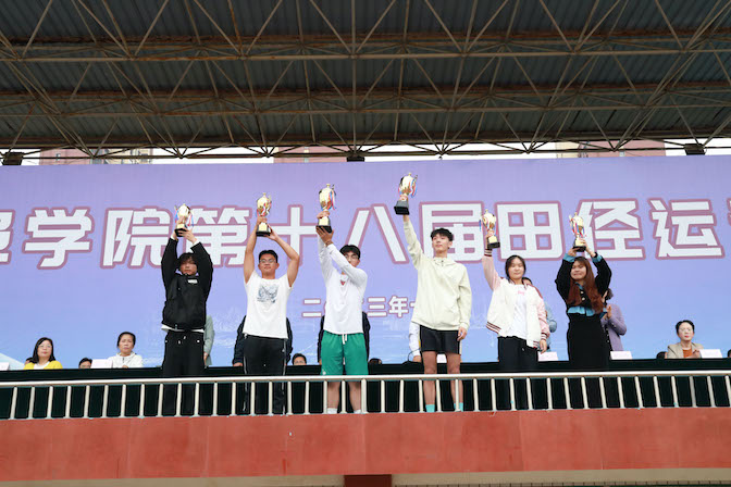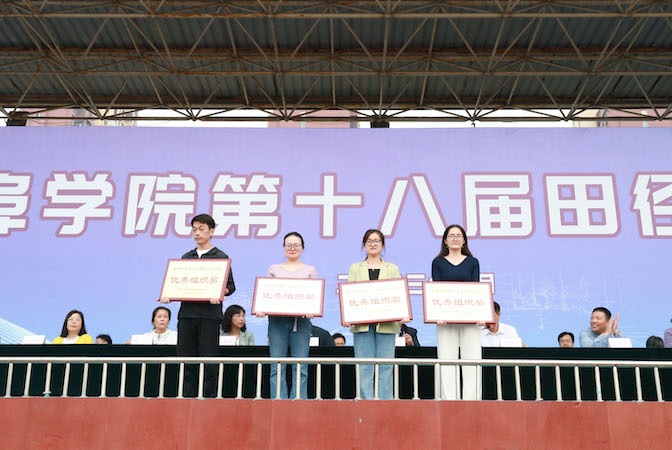 在欢快的乐曲声中,校领导为获奖单位一一颁奖。蚌埠学院第十八届田径运动会在全体人员齐唱《歌唱祖国》的激昂歌声中胜利闭幕。