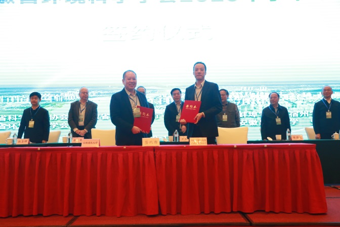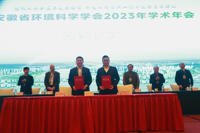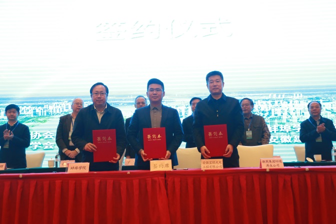 大会现场,安徽建筑大学、蚌埠学院、宿州学院分别与安徽环境科技集团股份有限公司、安徽宝绿光电工程有限公司、安徽省徽商环境资源再生科技有限公司、安徽禾美环保集团有限公司签订产学研合作协议。
