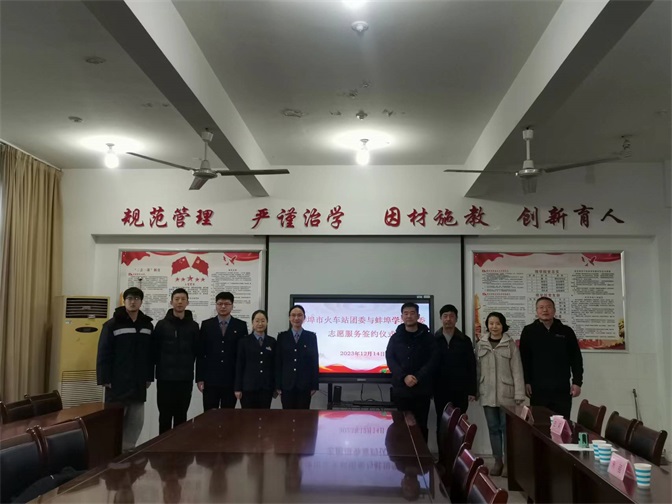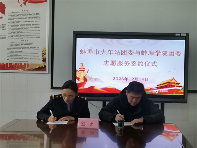 为进一步加强学生校外志愿服务活动管理,推进志愿服务常态化、规范化发展,充分发挥青年学生的光和热,12月14日上午,共青团蚌埠学院委员会与蚌埠市火车站团委签订了志愿服务合作协议,签约仪式在学校数理学院会议室举行。蚌埠市火车站团委、校团委全体工作人员及学生志愿者代表共同参加了签约仪式。