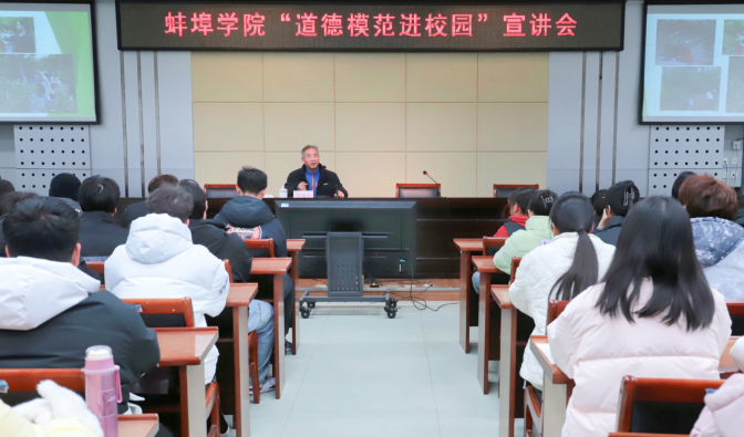 为深入学习贯彻习近平新时代中国特色社会主义思想,弘扬社会主义核心价值观,增强全校师生的社会责任感。蚌埠学院于2023年12月26日下午举办了“道德模范进校园”主题宣讲活动,邀请中国好人、蚌埠市道德模范、致公党蚌埠市委副主委、蚌埠日报社主任记者张建平来校进行主题宣讲。党委宣传部副部长黄灿主持。