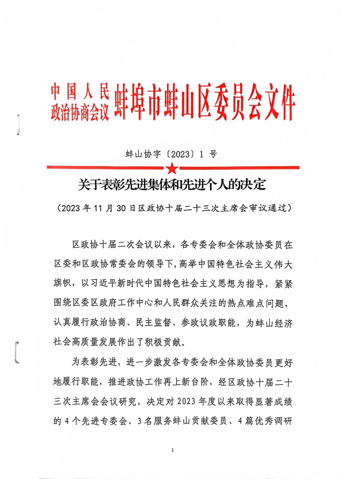 近日,政协蚌埠市龙子湖区委员会、蚌山区委员会先后召开会议,表彰在2023年度政协工作中做出积极贡献的先进集体和先进个人,我校民主党派政协委员荣获多项表彰。其中,蚌山区政协常委殷娜荣获蚌山区政协2023反映社情民意先进个人、蚌山区政协2023风采委员,龙子湖区政协常委张玮荣获龙子湖区优秀提案人。