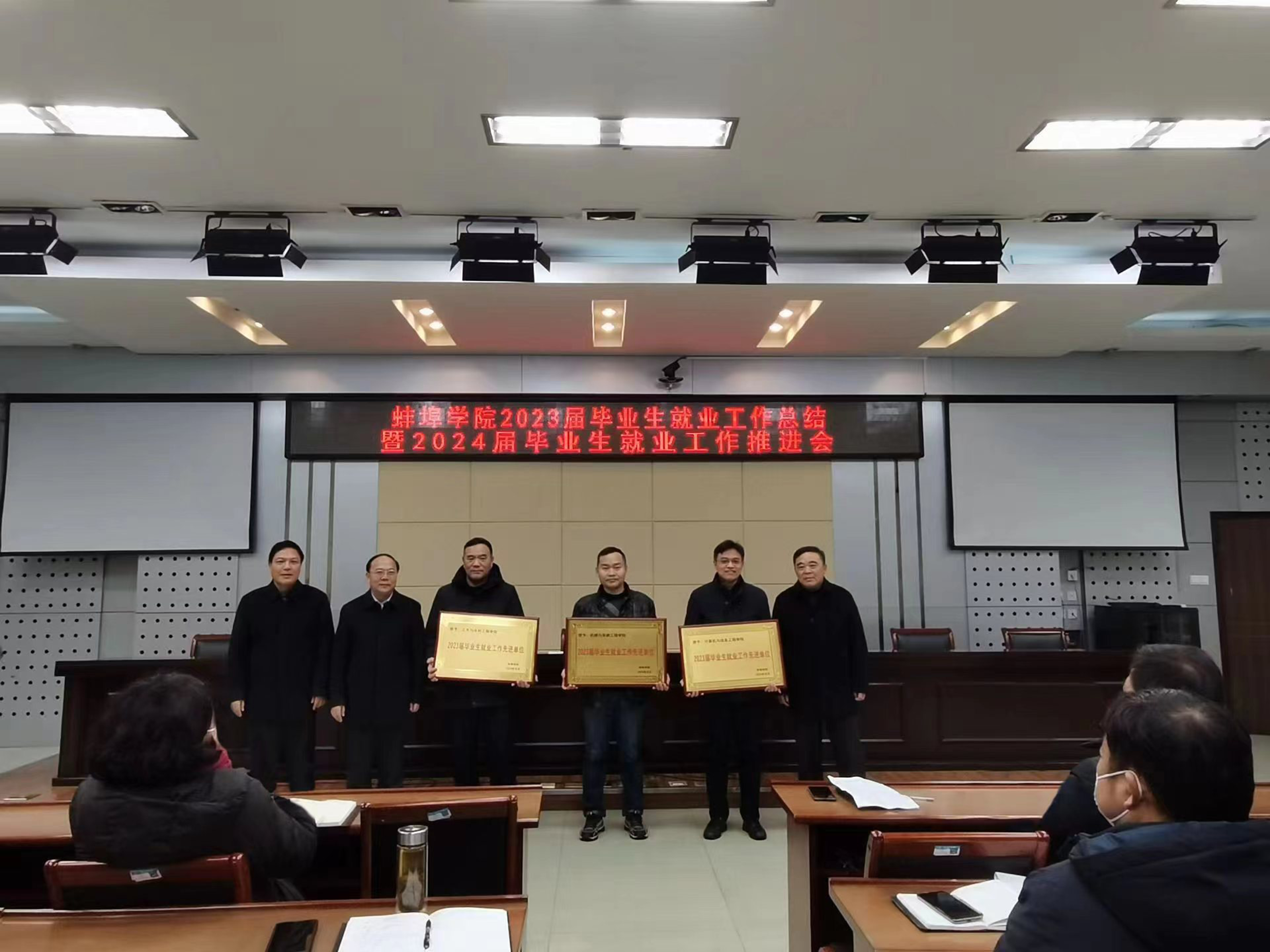 郭有强宣读了蚌埠学院关于表彰2023届毕业生就业工作先进单位的决议文件。陈国龙、韦文联、郭有强分别为受表彰的机械与车辆工程学院、计算机与信息工程学院、土木与水利工程学院颁奖。