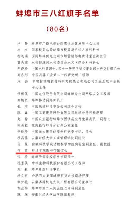 为激励先进、树立榜样,充分发挥先进典型的教育、鼓舞、引领作用,营造学习模范、争当先进的浓厚氛围,蚌埠市妇联授予80名同志为2023年度蚌埠市三八红旗手,30个单位为2023年度蚌埠市三八红旗集体。民盟蚌埠学院总支盟员、图书馆副馆长何蕾荣获蚌埠市三八红旗手称号。(撰稿:钱尔红;编辑:毛星懿;审核:黄灿)