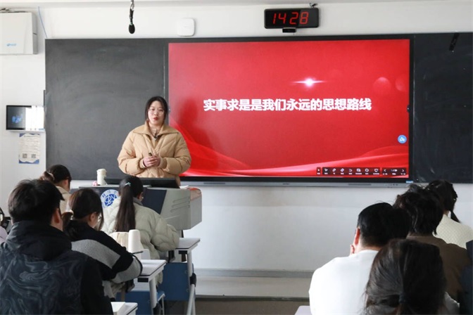 3月14日,学校举办“让更多学生爱上‘真理的味道’思政课示范公开课”,主讲教师张子怡就《毛泽东思想和中国特色社会主义理论体系概论》课程中“实事求是是我们永远的思想路线”相关内容,寻根问源、正反对比,组织学生围绕“作为一名新时代的大学生,应该如何在学习和生活中坚持实事求是”开展了热烈的小组讨论。