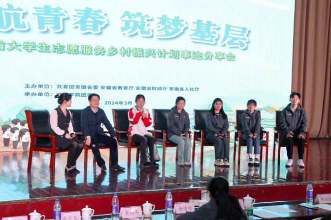 为进一步弘扬志愿精神,持续扩大西部计划和我省乡村振兴计划综合影响力,2024年3月29日下午,“启航青春 筑梦基层”安徽省大学生志愿服务乡村振兴计划事迹分享会在学术报告厅举办。院党委副书记韦文联、团省委学校部部长邹永生、省学联驻会执行主席恽郑曦、院团委书记哈焱及各院系师生代表共计500余人参加分享会。