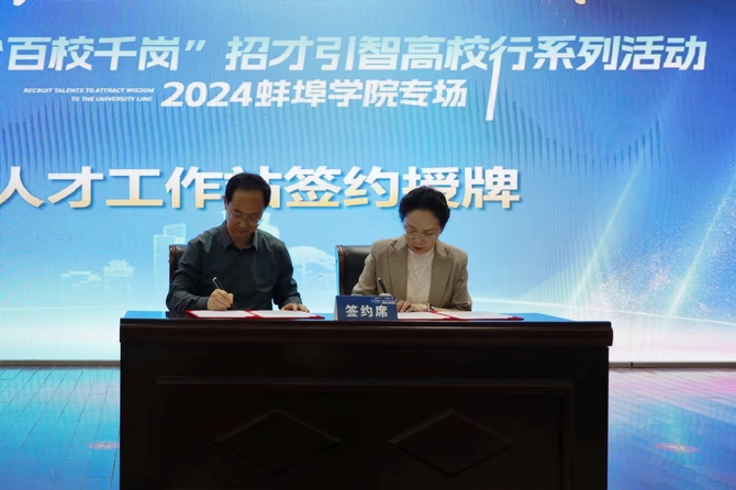 现场,学校与黄山市进行“黄山市驻蚌埠学院人才工作站”签约授牌仪式。