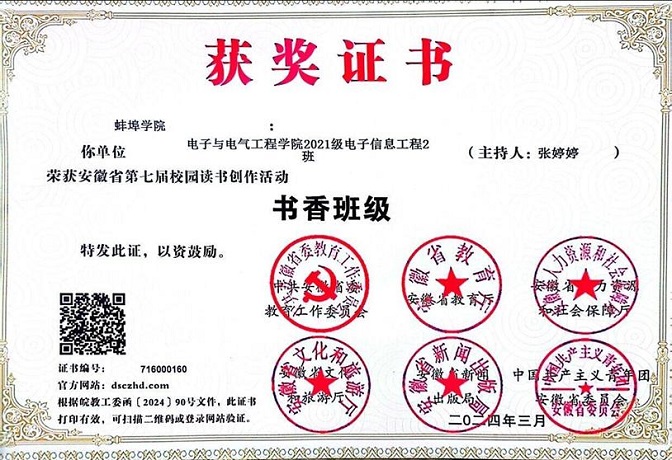 近日,安徽省委教育工委、安徽省教育厅、安徽省人社厅、安徽省文旅厅、安徽省新闻出版局、共青团安徽省委员会共同举办的安徽省第七届校园读书创作活动对蚌埠学院电子与电气工程学院2021级电子信息工程2班颁发了“书香班级”荣誉称号。