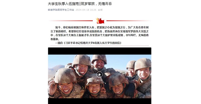 多措并举提升宣传实效。学校征兵工作站利用2024届毕业生招聘会及实习返校的时机,在校园内开展大学生入伍宣传动员、政策咨询、报名登记活动。印制征兵宣传手册逐一发放到学生手中,设立户外征兵咨询点,组织八一社团开展征兵宣传活动,让退役学生现身说法;同时利用官方微信、“易班”等新媒体平台进行宣传,讲解优抚优待政策、应征入伍的有关要求和注意事项,充分调动学生入伍积极性。