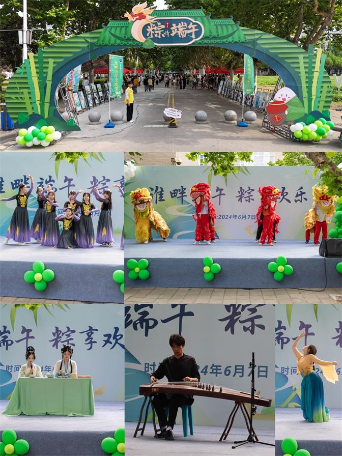 6月7日,端午文庙会在图书馆与学生宿舍主干道、运动场和第一食堂举办,包括活动体验、文化宣传以及才艺展示三项内容,第一食堂举办了《“粽”享快乐》教职工包粽子大赛,由文学与教育学院2023级和2022级的学子们悉心打造的文庙小集供全校师生参观和体验。现场设置的草编、蛋雕、剪纸和面塑非遗摊位由非遗传承人现场制作,极具意趣,其中,由蚌埠市非遗剪纸传承人吴桂兰女士负责经营的摊位,吸引了众多热爱非遗文化的学子们,彰显了非遗文化一代代人接力传承的力量。文化宣传区设立了安徽各地市的端午文化宣传板,充分展现了极具安徽特色的端午习俗和源远流长的传统文化,文化展示不仅加深了学生对端午文化的认识,也让学生充分领略到了安徽端午文化的特有韵味。才艺展示区,舞台上精彩呈现了古筝演奏、舞龙舞狮、古典舞和中国风歌曲等表演,赢得阵阵喝彩,成为全校师生观赏和放松的绝佳场所,给师生们带来了一场难忘的艺术盛宴。
