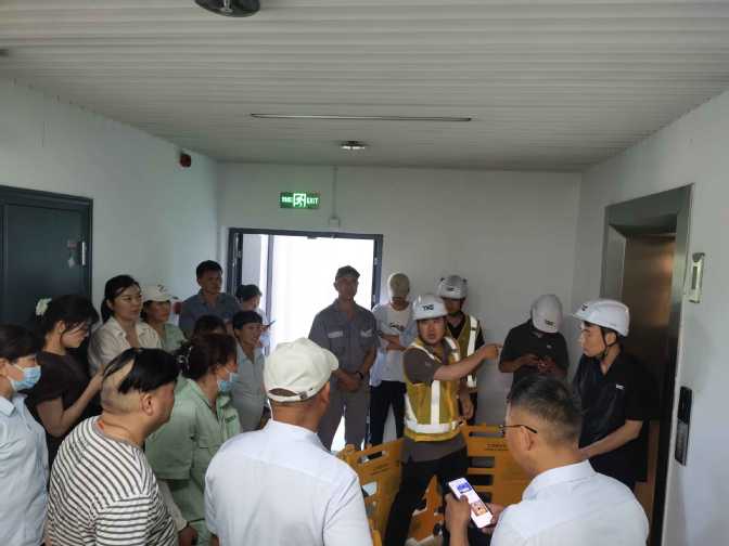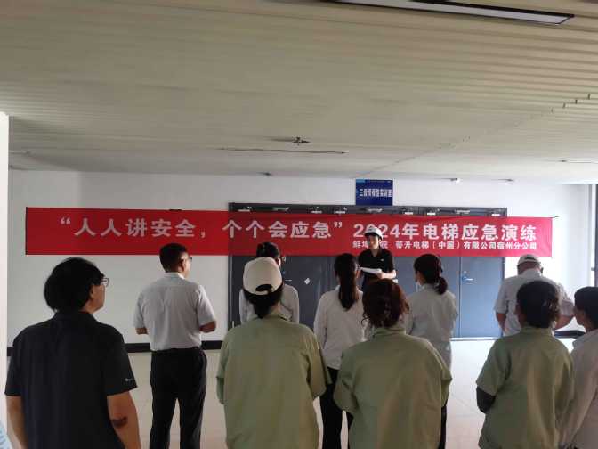 演练开始前,蒂升电梯(中国)有限公司宿州分公司经理江凯现场讲解了电梯安全使用要点和乘坐电梯的注意事项。演练模拟了电梯突发故障,多名乘客被困的紧急情况。被困人员通过电梯内的紧急呼叫装置求救,接到故障报告后,迅速启动应急预案,电梯技术人员、安全管理人员立即到场,确认被困电梯位置。按照预定程序,设置警示牌、警戒线,迅速有序展开救援,使用专业工具稳定电梯轿厢,快速定位故障原因,并进行修复。同时,救援人员对被困人员进行心理安抚。整个演练过程紧张有序,参与人员协同配合,展现了高效的协作能力。