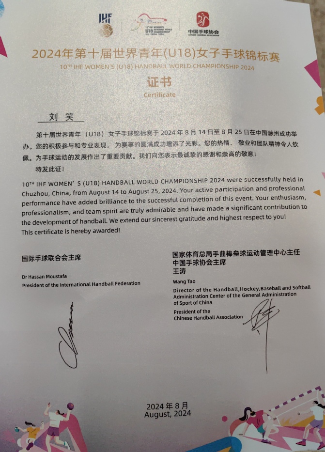 8月25日,2024年第十届世界青年(U18)女子手球锦标赛在安徽省滁州市顺利落幕。至此,我院青年教师刘笑也顺利完成竞赛官员工作。
