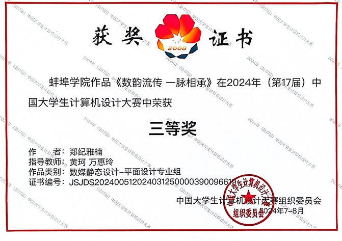 同时,第17届“中国大学生计算机设计大赛”数媒静态设计组全国总决赛于8月在东北大学圆满落下帷幕。郑纪雅楠同学的作品《数韵流传一脉相承》(指导老师:黄珂、万惠玲)斩获国赛三等奖。