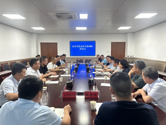 9月10日下午,党委副书记、院长孙艳辉率队赴怀远县开展校地合作对接,蚌埠市委常委、怀远县县委书记潘君齐,县委副书记、县长高东升,副县长杨杰,县政协副主席何玲,我校学术副校长郑能干出席考察调研座谈会,科研处、材料与化学工程学院、生物与食品工程学院和怀远县直单位负责同志参加。