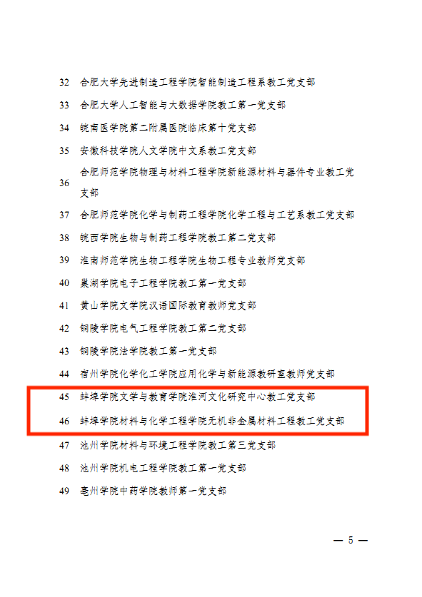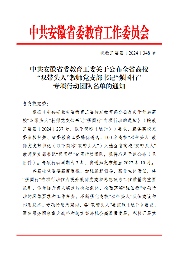 近日,安徽省委教育工委公布了全省高校“双带头人”教师党支部书记“强国行”专项行动团队名单,我校材料与化学工程学院无机非金属材料工程教工党支部和文学与教育学院淮河文化研究中心教工党支部成功入选,这是继学校获批国家级样板支部立项建设后,在党建工作上取得又一新进展。