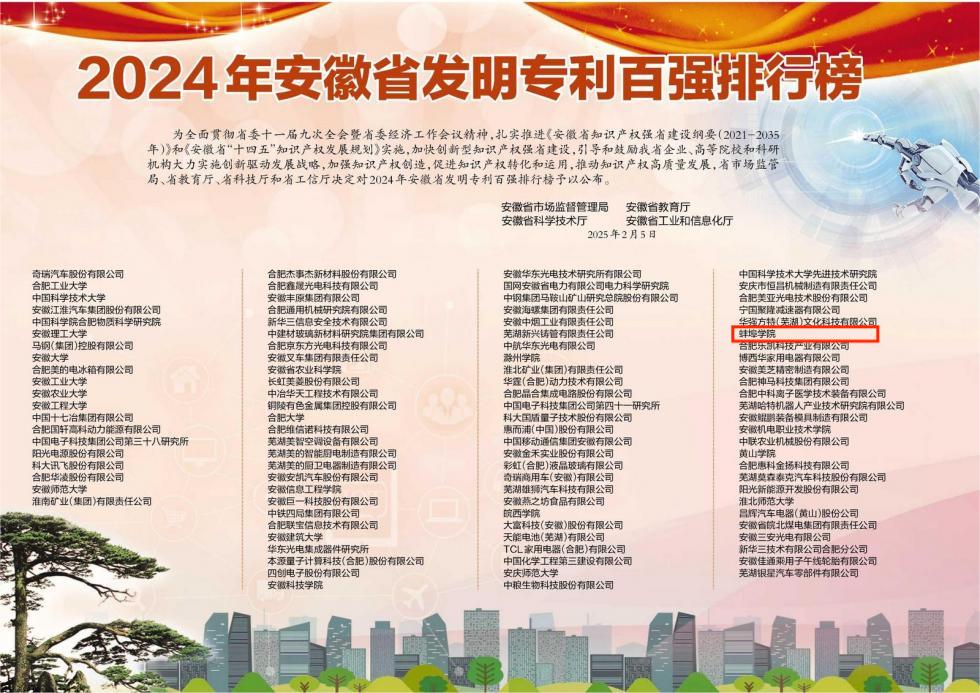 近日,安徽省市场监督管理局、安徽省科学技术厅、安徽省教育厅、安徽省工业和信息化厅联合发布2024年安徽省发明专利百强排行榜。我校继2023年后,再次荣登安徽省发明专利百强,这是对我校师生科技创新工作的充分肯定。