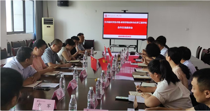 8月28日下午,五河县科学技术局党组书记刘武、局长鲍文娟一行到访蚌埠学院材料与化学工程学院,就产学研合作事宜进行座谈交流。学校科研处副处长周开胜、材化学院院长葛金龙及相关博士参加,会议由学院党委书记张敏主持。