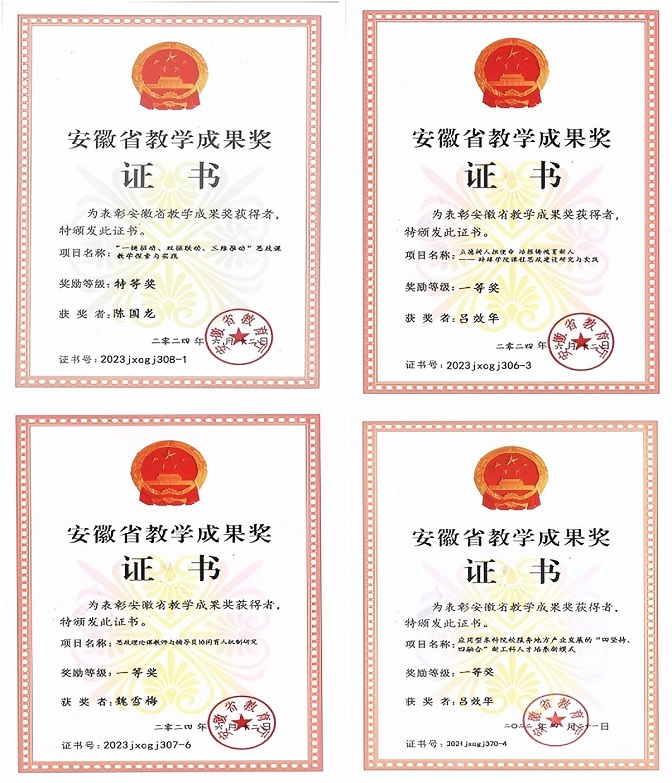 教学成果显著:累计获安徽省教学成果奖12项(含特等奖1项、一等奖2项),其中省级特等奖“一链驱动、双驱联动、三维推动”教育教学改革成果示范效应突出;获批省级重大教改项目7项,在全省11所同类本科院校中稳居首位;同时获批省级教学创新团队3个、省级名师工作室2个,改革成果得到权威认可。