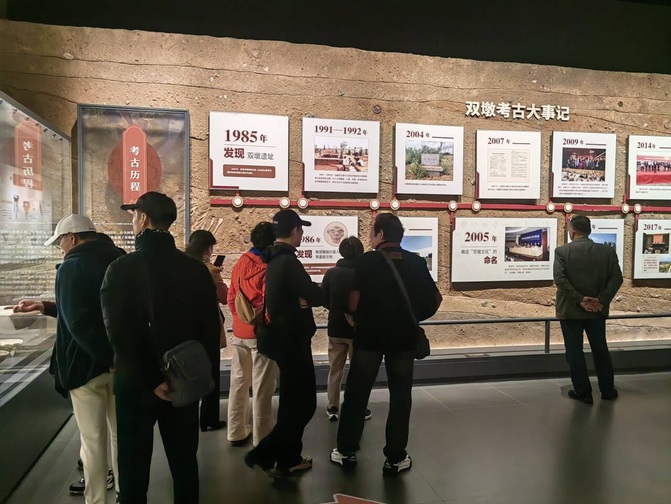 随后,一行人前往蚌埠双墩国家考古遗址公园,开启淮河文明溯源之旅。作为淮河中游地区新石器时代早期重要的考古遗址,双墩遗址于1985年被发现,其年代距今约7300年,是淮河文明起源与发展的关键见证地。在专业讲解员的引导下,离退休教职工和党员们饶有兴趣地参观了遗址展示区与文物陈列,仔细聆听双墩遗址的发掘历程、文化特征及历史价值。从刻画符号到生活器具,一件件珍贵的文物让大家直观感受到淮河文明的起源与发展脉络,深刻认识到蚌埠作为淮河文化重要发源地的深厚历史底蕴。