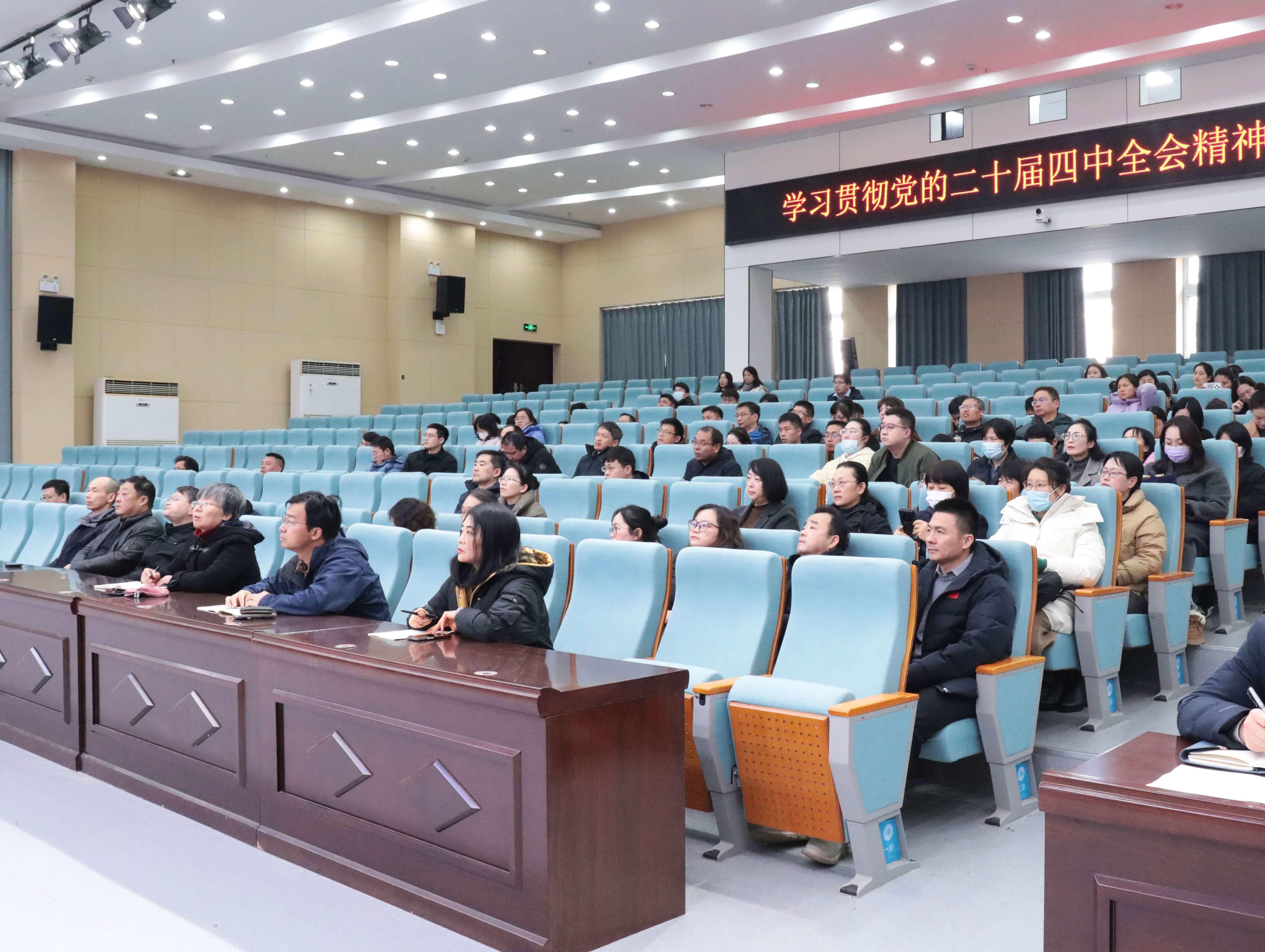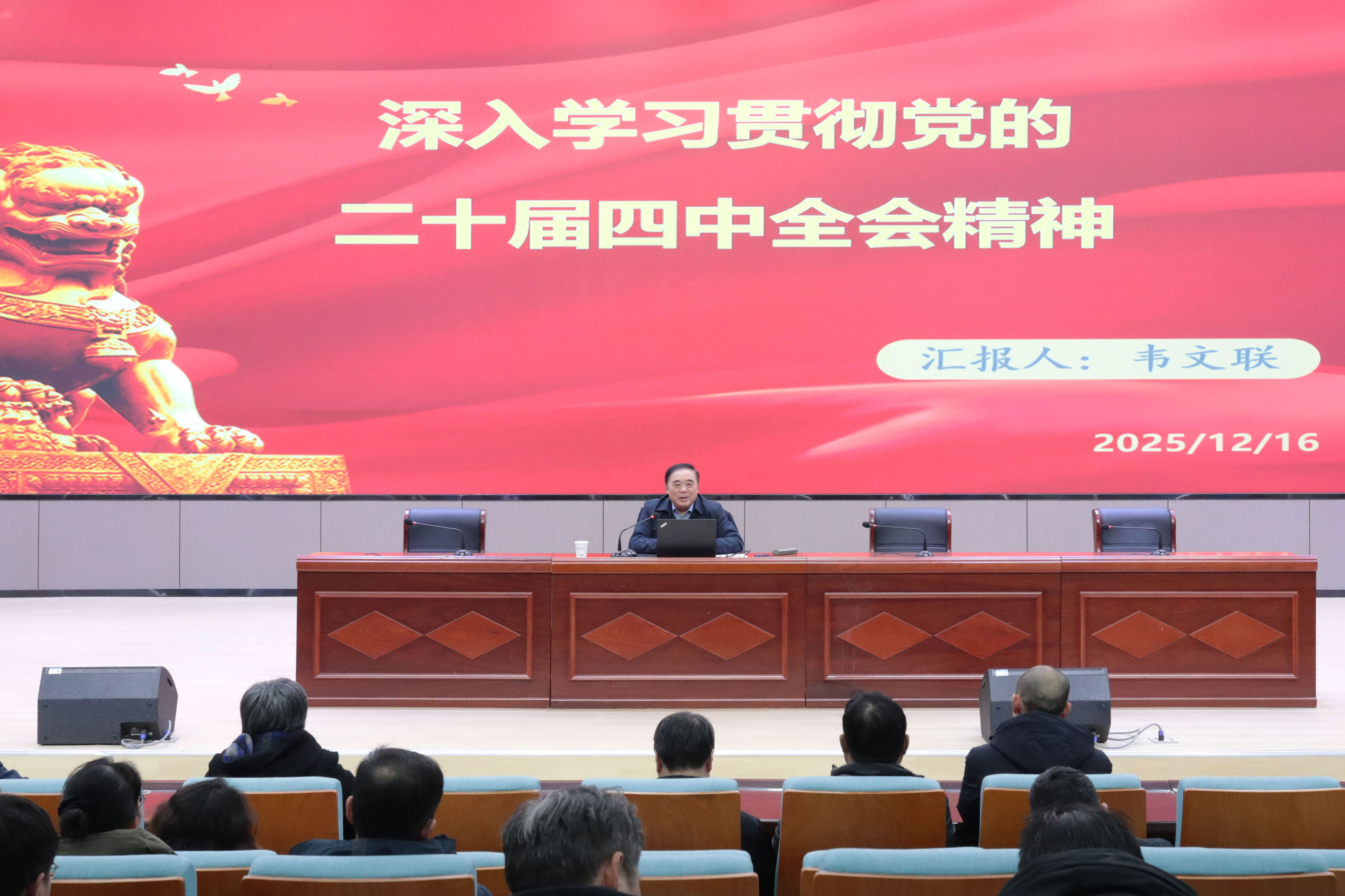 12月16日下午,学校党委副书记韦文联在学术报告厅作党的二十届四中全会精神宣讲。党委组织部、党委宣传部、党委学生工作部、工会、团委全体人员,食品与生物工程学院、外国语学院科级以上干部、党支部书记,各学院党委书记、副书记、全体辅导员,民主党派代表和学校青马工程培训班学员代表参加宣讲会。