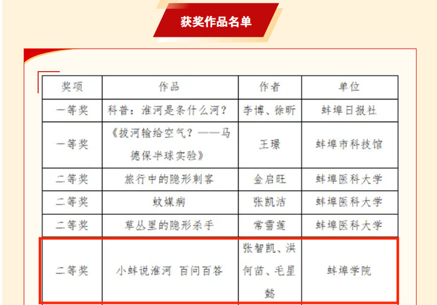 近日,“千万IP创科普”蚌埠科普短视频大赛评选结果揭晓,由我校师生团队创作的动画微课短视频《小蚌说淮河百问百答》荣获大赛二等奖。该作品由张智凯、洪何苗、毛星懿策划制作,以原创IP形象“小蚌”为主讲人,其设计融合贝壳、珍珠等淮河流域特色文化元素,生动展现地方文化魅力与科普创新力。