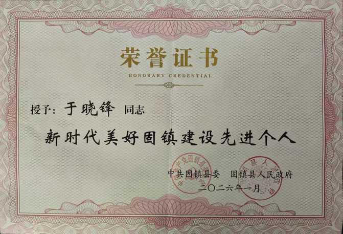 2026年1月27日,蚌埠市固镇县委、县政府对“新时代美好固镇”建设先进集体和先进个人进行了表彰。蚌埠学院材料与化学工程学院副教授于晓锋博士被授予2025年度“新时代美好固镇”建设先进个人荣誉称号,以表彰其在推动地方产业技术创新与校企融合发展中做出的突出贡献。