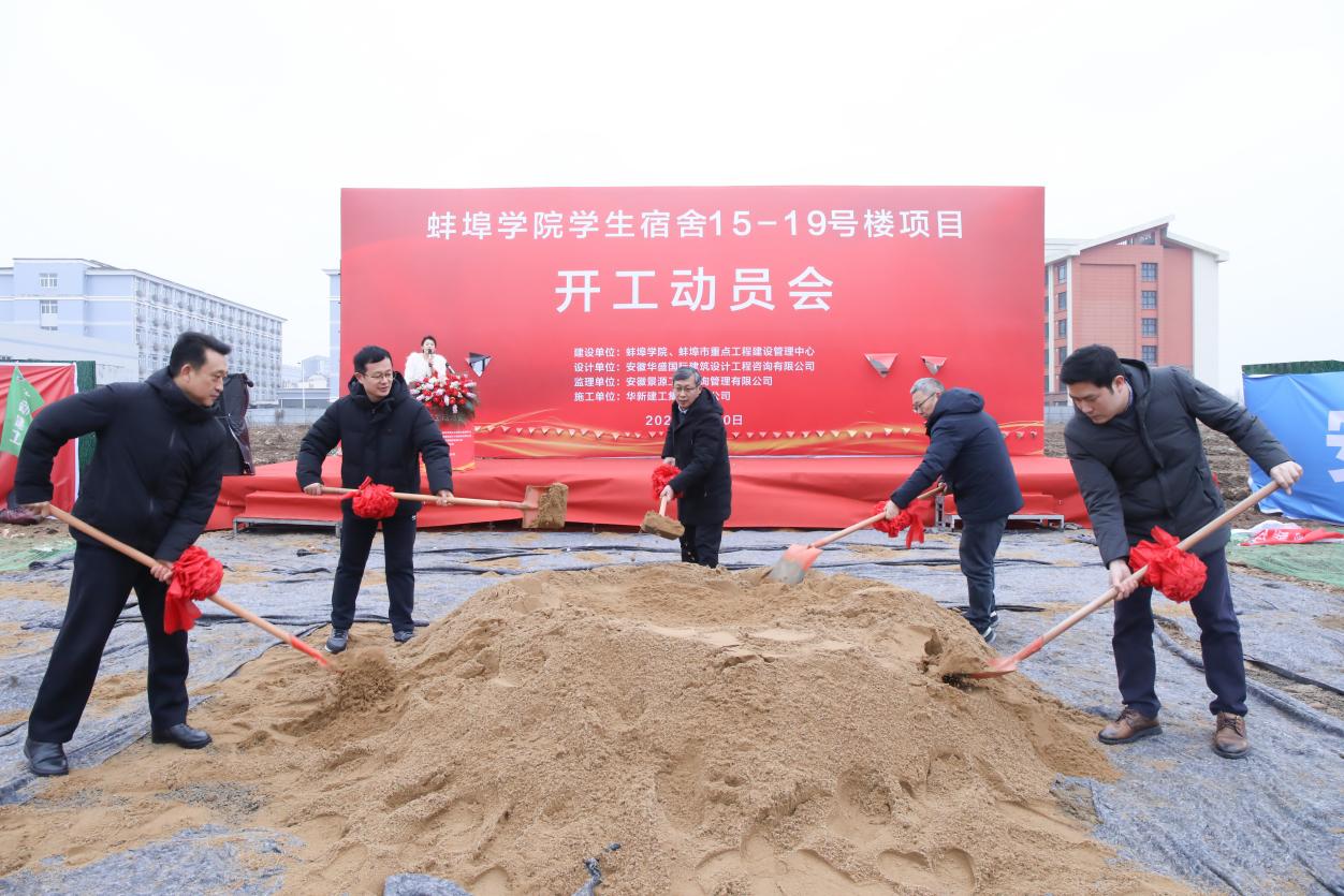 2026年1月30日上午,蚌埠学院学生宿舍15-19号楼项目开工动员会顺利举行,蚌埠学院党委委员、副校长马伟,代建单位蚌埠市重点工程建设管理中心副主任周钢,蚌埠城建投资发展有限公司总经理梁万磊,施工单位华新建工集团有限公司集团副总裁吕厚俊等出席,学校相关职能部门负责人、参建单位代表参加。