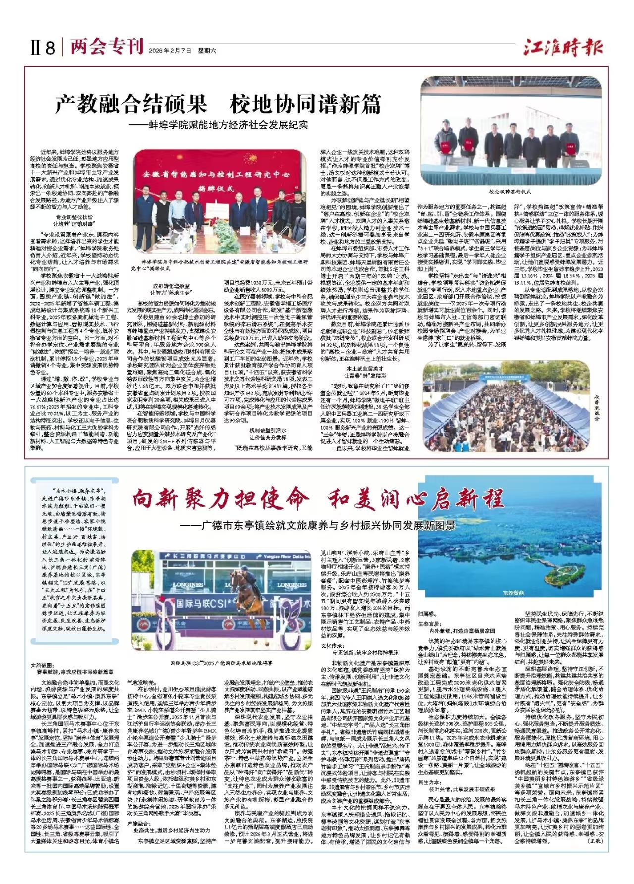 2026年2月7日,《江淮时报》在两会专刊刊发长篇通讯《产教融合结硕果 校地协同谱新篇——蚌埠学院赋能地方经济社会发展纪实》,全面报道我校紧扣地方产业需求、深化产教融合、服务区域高质量发展的创新实践与显著成效,以省级权威媒体视角展现蚌院作为地方应用型高校的责任担当与办学成果。