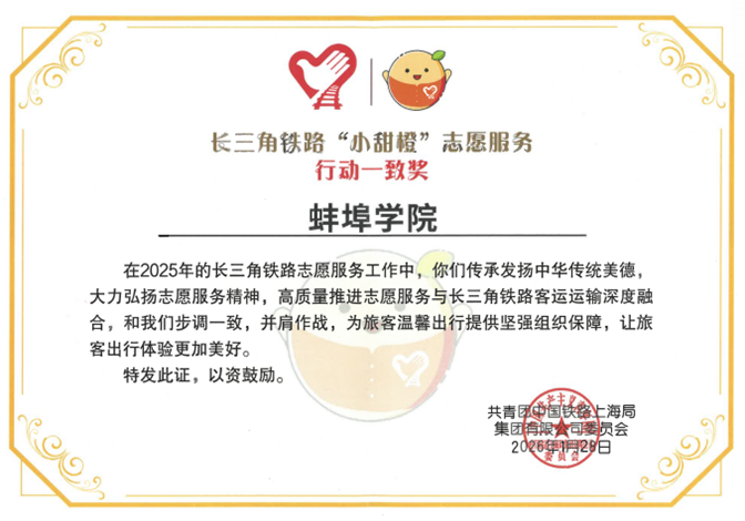 长三角铁路“小甜橙”志愿服务“行动一致奖”,旨在表彰在铁路客运服务中表现突出、与铁路部门配合默契的志愿服务集体。自2017年起,数理学院团总支便组织和开展了与蚌埠高铁站志愿服务结对活动,与铁路志愿服务结下了不解之缘。九年来,每逢国家法定节假日、春运及周末客流高峰,数理学院志愿者都会出现在蚌埠高铁南站,形成了一支“拉得出、用得上、服务好”的常态化志愿服务力量。2023年12月,在校地双方共同推动下,学校与蚌埠市火车站团委正式签订志愿服务合作协议,为数理学院的志愿服务工作提供了坚实的制度保障。